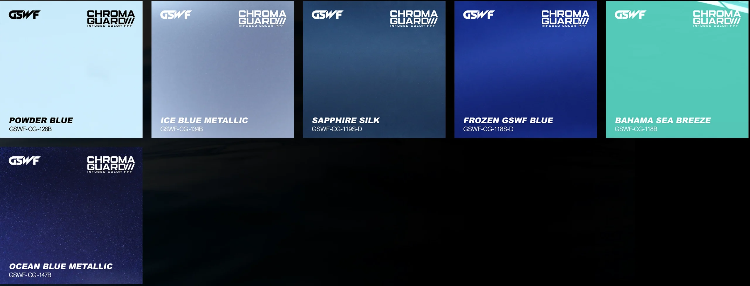 Powder Blue (آبی پودری)، Ice Blue Metallic (آبی یخی متالیک)، Sapphire Silk (ابریشم یاقوت کبود)، Frozen GSWF Blue (آبی GSWF یخزده)، Ocean Blue Metallic (آبی اقیانوسی متالیک)، و Bahama Sea Breeze (نسیم دریای باهاما) است.